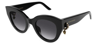 Introducing the Alexander McQueen AM0417S sunglasses, a striking embodiment of contemporary elegance designed for the bold woman. Crafted from recycled acetate, the sleek black frame not only exudes sophistication but also embodies a commitment to sustainability. The iconic cat-eye shape adds a touch of vintage charm while perfectly complementing modern aesthetics. Each pair features lenses made from bio nylon in a chic grey hue, offering exceptional clarity and UV protection. With their unique blend of luxury and responsibility, these sunglasses are perfect for the fashion-forward individual who values authenticity in every detail. Embrace your style with the Alexander McQueen AM0417S sunglasses and make a statement that resonates. Experience the perfect fusion of fashion and function in your eyewear collection today.