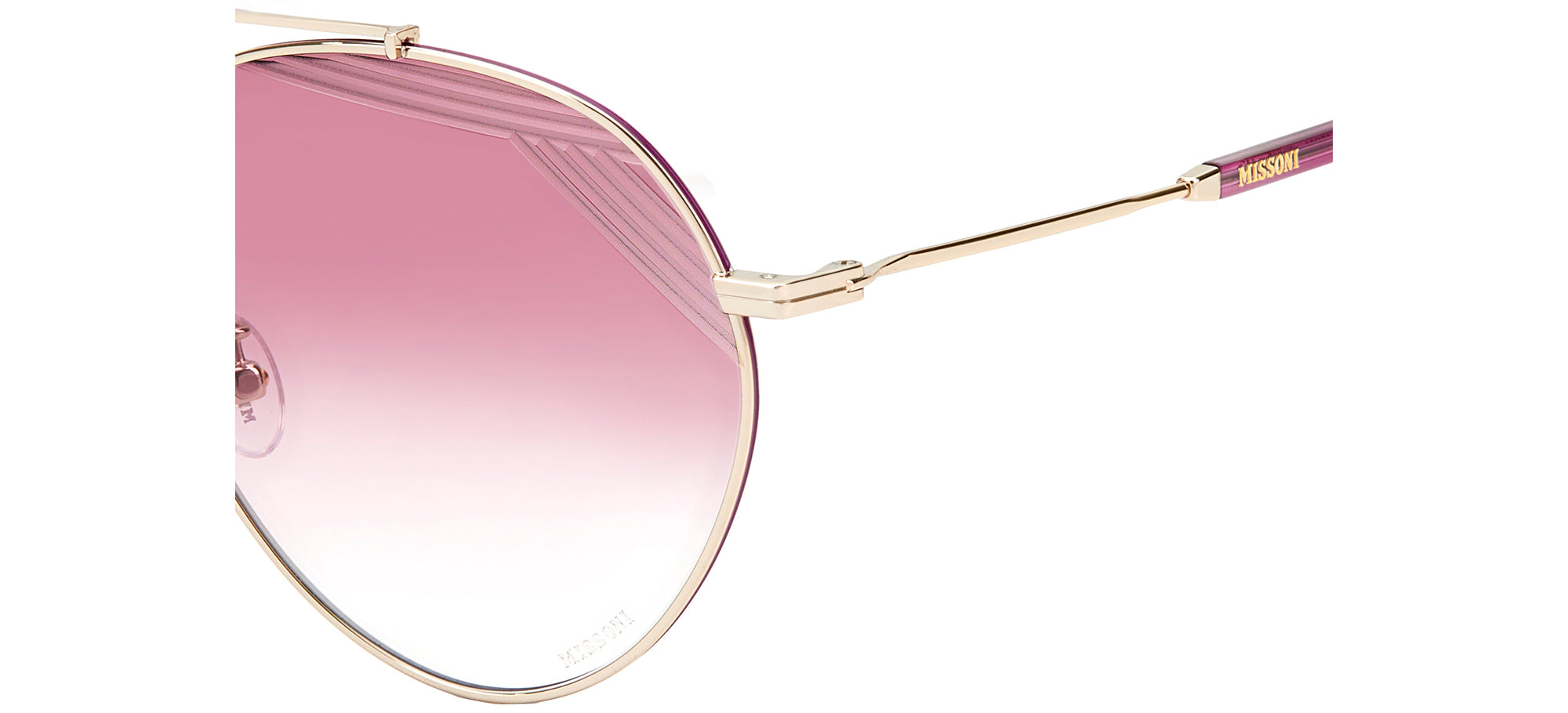Missoni MIS 0015/S women sunglasses bring Italian couture to a classic pilot silhouette. A slender gold steel frame pairs with pink nylon lenses for a striking contrast that balances fashion and function. Authentic Missoni detailing signals premium craftsmanship and original design, while the lightweight construction ensures comfortable all day wear. These designer sunglasses suit style conscious women who want a statement accessory with reliable UV protection and enduring build. For a refined look that stands apart, view fit options and order your Missoni MIS 0015/S pair today.