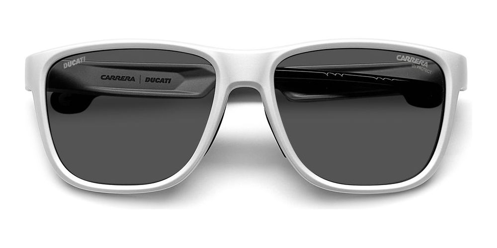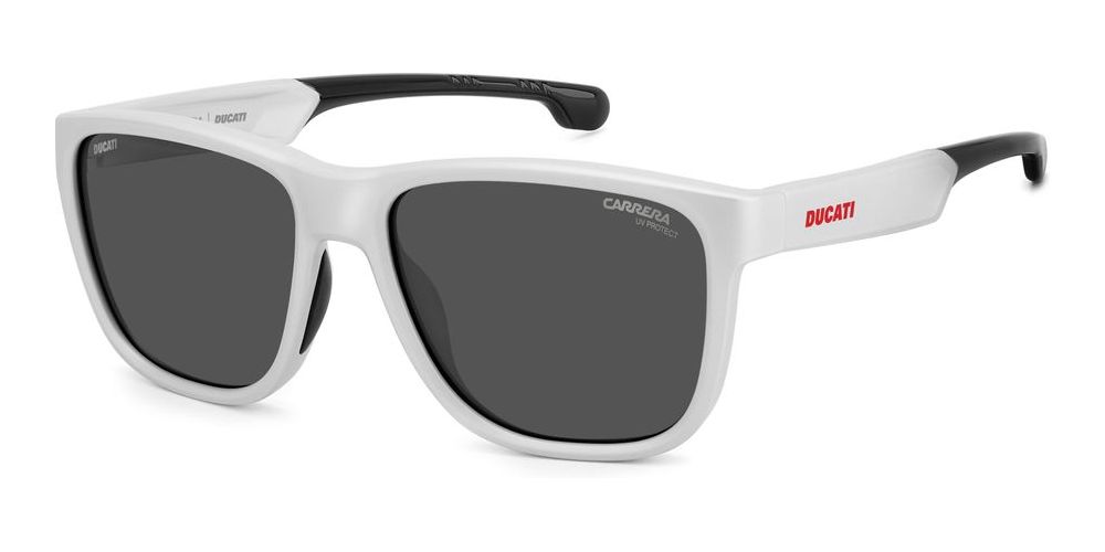 Carrera Ducati CARDUC 003/S men's sunglasses combine racing heritage with refined style. The white Injection propionate frame is lightweight and durable while grey polycarbonate lenses deliver impact resistance and crisp optics. An adjustable lens mechanism lets you tailor fit and coverage for active use. CARDUC 003/S pairs premium materials with authentic Italian design for original, performance focused eyewear. Find your size and order now on Otticanet.