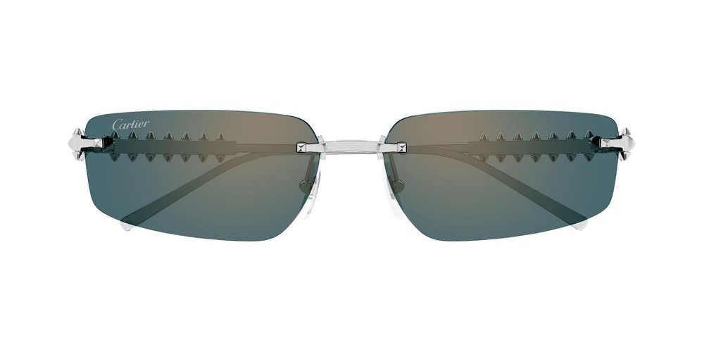 Introducing the Cartier CT0544S sunglasses from the exclusive Clash de Cartier collection. Crafted for both men and women, these unisex sunglasses feature a striking rectangular shape that exudes sophistication. The premium metal frame in a sleek silver finish complements the vibrant blue BIO NYLON lenses, offering both style and protection. Designed with adjustable lens technology, these sunglasses provide a personalized fit for ultimate comfort. Experience the perfect blend of originality and authenticity that Cartier is renowned for. Perfect for those who appreciate luxury and distinctive fashion. Explore the allure of Cartier's craftsmanship and make a statement with the CT0544S sunglasses.