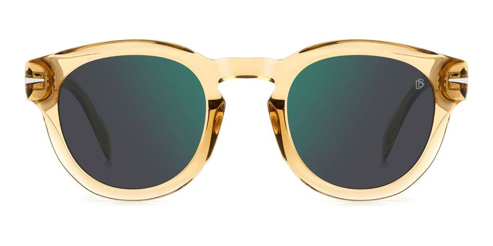 David Beckham DB 7041/S FLAT sunglasses for men pair a bold round acetate frame in vibrant yellow with green polyester mirror lenses that are adjustable for a custom fit. Authentic David Beckham sunglasses combine premium acetate craftsmanship and modern mirror lens technology for standout style and comfort. Ideal as designer sunglasses for men seeking original, high quality eyewear. Shop now to secure your pair.