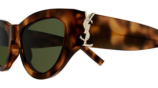 a strong feminine cat-eye shape, the evolution of the monogram acetate in a bolder and new iconic versionthe mythic ysl signature is integrated as an hinge detail and made highly visible on both bold temples